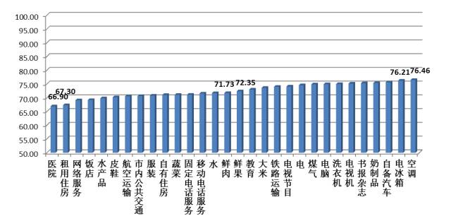 在被调查的七个大类消费品和服务中,按照满意度指数由高到低排序,依次为:家庭设备用品及服务类75.88点,教育文化娱乐服务类73.78点,交通和通信类72.39点,居住类72.07点,食品类70.87点,衣着类70.64点,医疗服务类66.90点。这说明:上海市民对家庭设备用品及服务类、教育文化娱乐服务类的满意程度最高,而对医疗服务类和衣着类的满意程度最低。