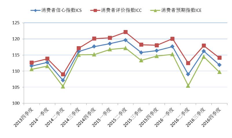 二、2016年第四季度上海市消费者信心指数仍在乐观区域,为111.9点,环比下降4.3点,同比下降4.4点