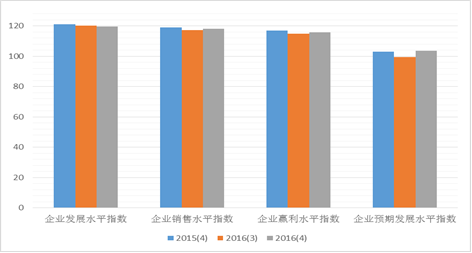 上海市企业家投资信心指数反映了企业家对于本企业生产经营现状的满意程度和对未来的预期。2016年第四季度上海市企业家投资信心指数为114.33点,环比上升1.36点,同比持平。本季度企业家投资信心指数的分类指数整体波动幅度较小,其中表现当前企业发展状况的企业发展水平信心指数为119.71点,与上季度持平,同比下降1.46点;反映企业销售水平的企业销售水平信心指数是为118.11点,环比与同比均基本持平;企业盈利水平信心指数为115.73点,环比持平,同比下降1.13点。企业预期发展水平信心指数为103.76点,较前一季度上升4.22点,同比持平,具体值数值见图7。