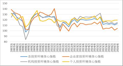 图6 上海财经大学2007年3季度至2016年4季度上海市投资环境信心指数图