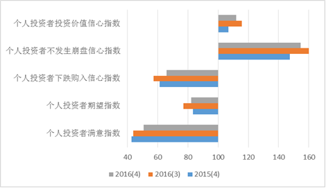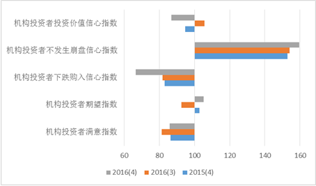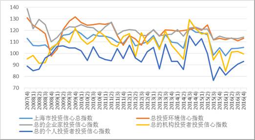 上海财经大学应用统计研究中心对上海市企业领导人或企业家、机构投资者和个人投资者的调查结果显示,2016年第四季度上海财经大学上海市投资者信心指数为105.23点,环比与同比均基本持平。指数位于乐观区域,表明上海市投资者心态较为积极稳定。